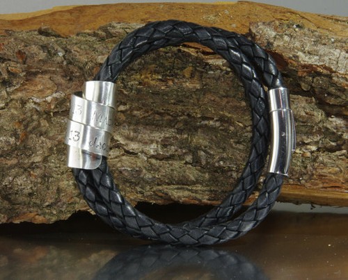 A handmade, personalized men's leather cuff. The secret message has been hand stamped by me on the sterling silver scroll. I personally hand stamp all of my cuffs by hand, so each cuff will be unique and truly custom made for you. Please expect some variations in color and alignment but note that this just adds to the charm of the custom piece.