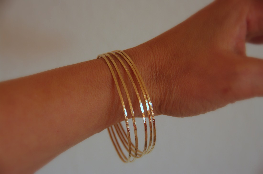 Buy 5 handmade, hammered, approx 2 mm thin stackable bangles / bracelets. They have been heavily hammered for shine and sparkle. The first picture ad the last one show 20 (twenty) stack bangles, while the third picture shows the actual listing for 5 x 14k gold fill bangles.