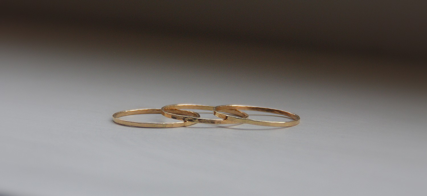 A petite, solid and hammered stacking ring is hand forged of warm 14 k Rose (Pink) gold.
