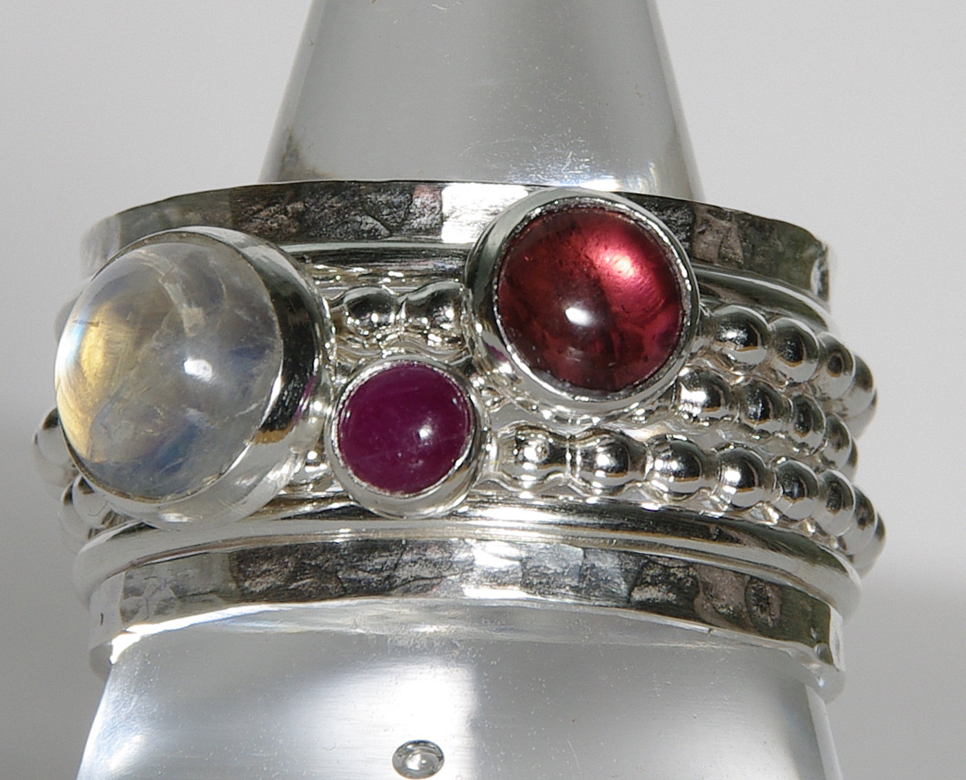A dotted, smooth, hand hammered set of 7 sterling silver stacking rings that includes a 6mm pink tourmaline gemstone, an 8 mm rainbow moonstone gemstone and a 4 mm ruby gemstone. All bands (rings) are made to order in your finger size. A lovely set of birthstone stackable gemstone rings, or mothers rings (family rings)