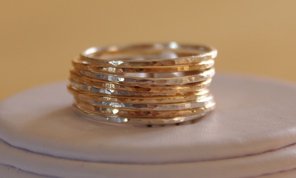 Here's a set of 9 (nine) handforged 14k goldfilled and sterling silver skinny, thin stackable rings that you can wear either together or individually. These stackable rings look great because they have been hammered and they are made of 18ga sterling silver wire.