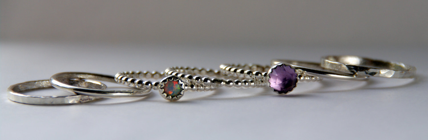 A dotted, smooth, hand hammered set of 7 sterling silver stacking rings that includes - Opal, and Rose de France Amethyst stones. A lovely Mother's Day gift!
