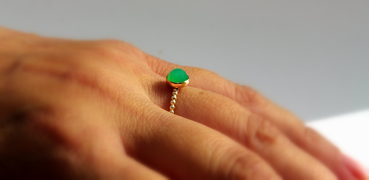 A ONE 14k gold filled 6 mm natural, dainty, rose cut chrysoprase stackable bezel ring made with yellow beaded / dotted gold filled wire. A lovely mother's ring gift, wedding jewelry or an anniversary gift!