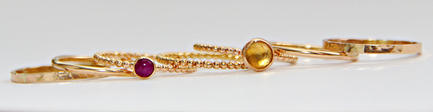 A dotted, smooth, hand hammered set of 7 x 14k YELLOW GOLD FILLED stacking rings that includes bezel set, faceted Citrine & smooth Ruby stones. A lovely Mother's Day gift!