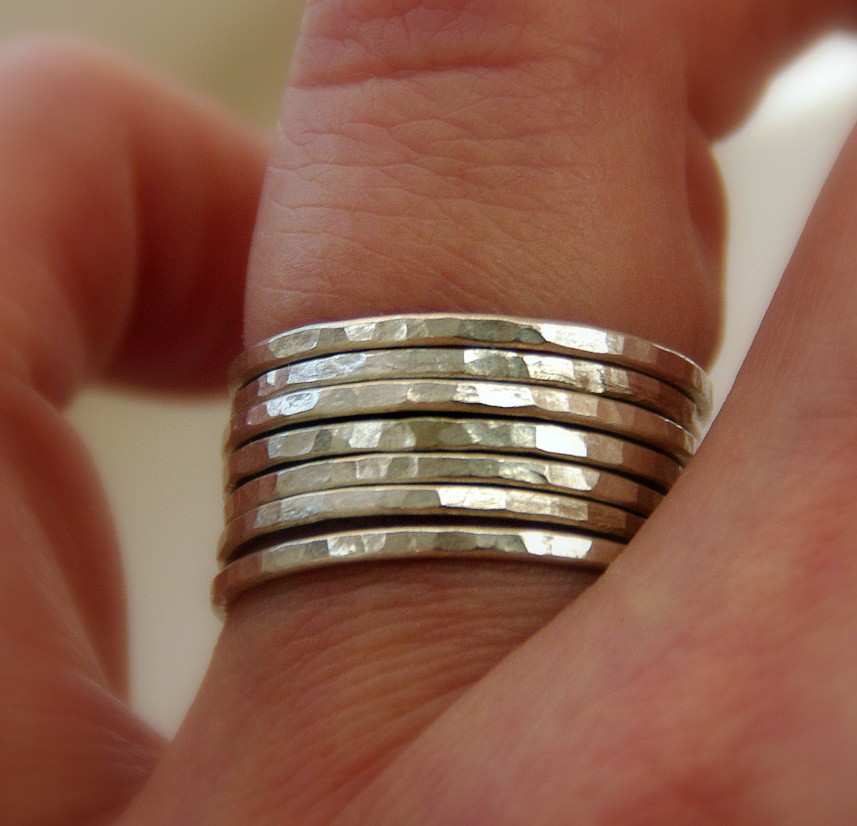 This entirely handmade and made to order set has 7 sterling silver bands. Each band is made from 16 gauge sterling silver wire. I hand forged the rings, hammered them for texture and tumbled for shine and sparkle.